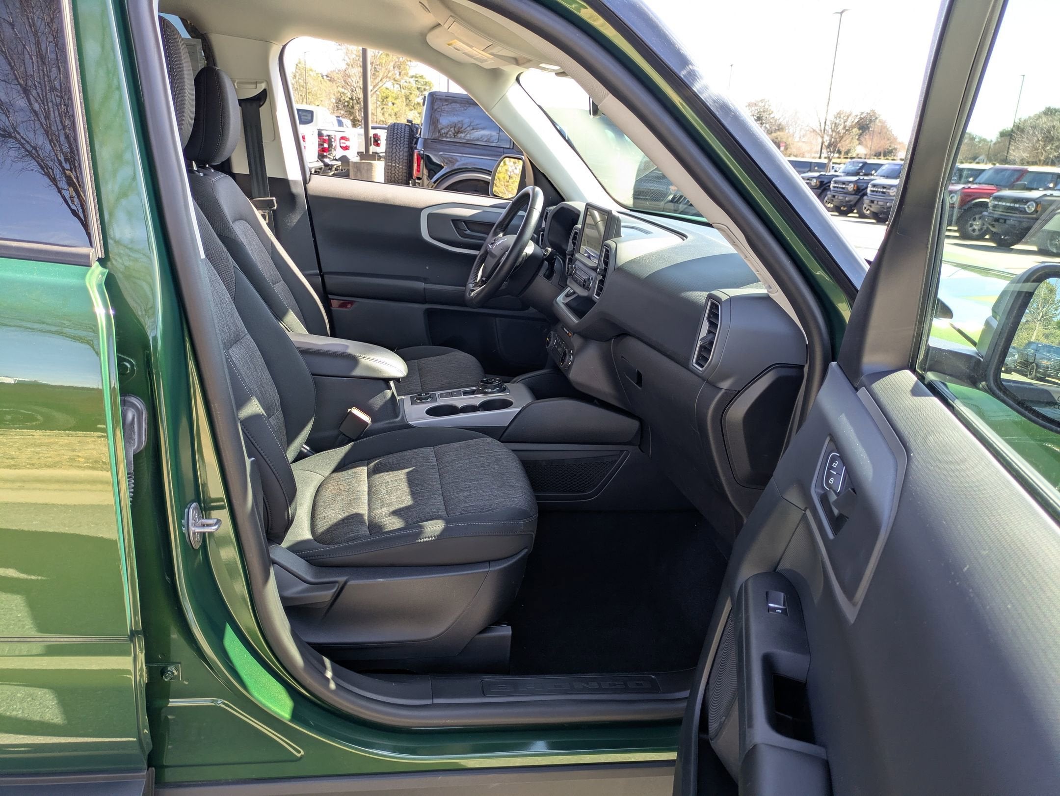 The interior is designed for the messy, wonderful reality of exploration, featuring Ebony Black unique cloth seats that are easy to clean. This model is loaded with the Convenience Package, providing premium touches like heated front seats, an 8-way power driver's seat, and a wireless charging pad. Technology is front and center with the SYNC 3 8-inch touchscreen, while the Terrain Management System with 5 G.O.A.T. Modes (Goes Over Any Type of terrain) ensures youre never stuck in the mud. With a rubberized cargo floor and rubberized seat backs, this Bronco Sport is as practical as it is adventurous.