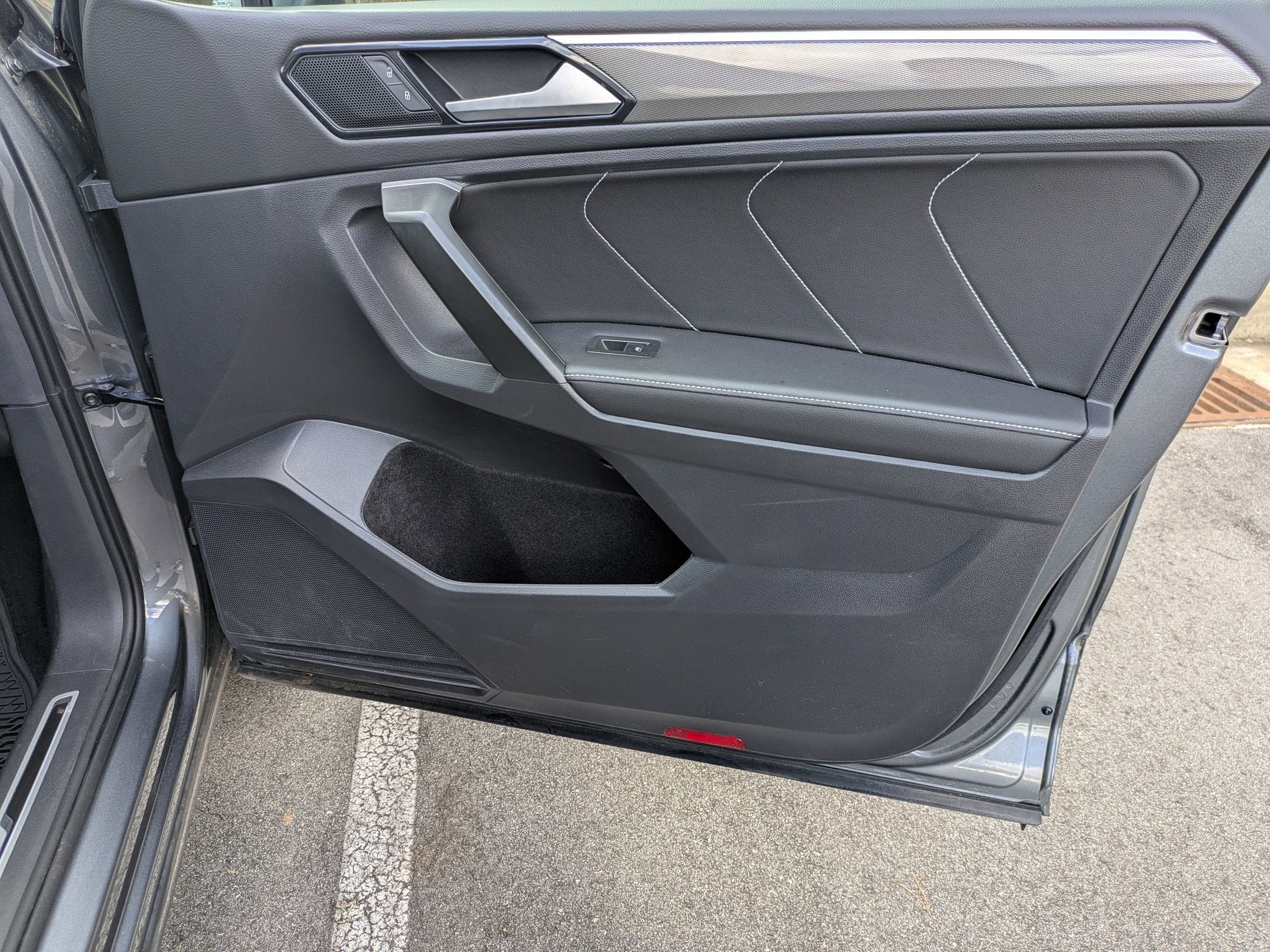 Panoramic sunroof, leatherette seating, Apple CarPlay and Android Auto, heated front seats, power liftgate, blind spot monitoring, adaptive cruise control, lane keeping assist, dual zone climate control, R-Line sport styling, alloy wheels, and push button start.